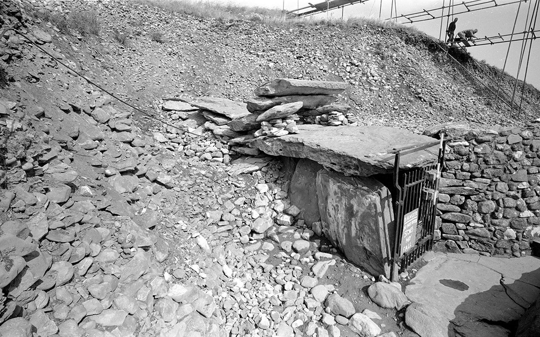 Newgrange passage tomb in the Boyne Valley, Co. Meath, Ireland. Picture taken during excavation by Prof. M. J. O’Kelly ME019-045—- Class: Megalithic tomb – passage tomb Townland: NEWGRANGE