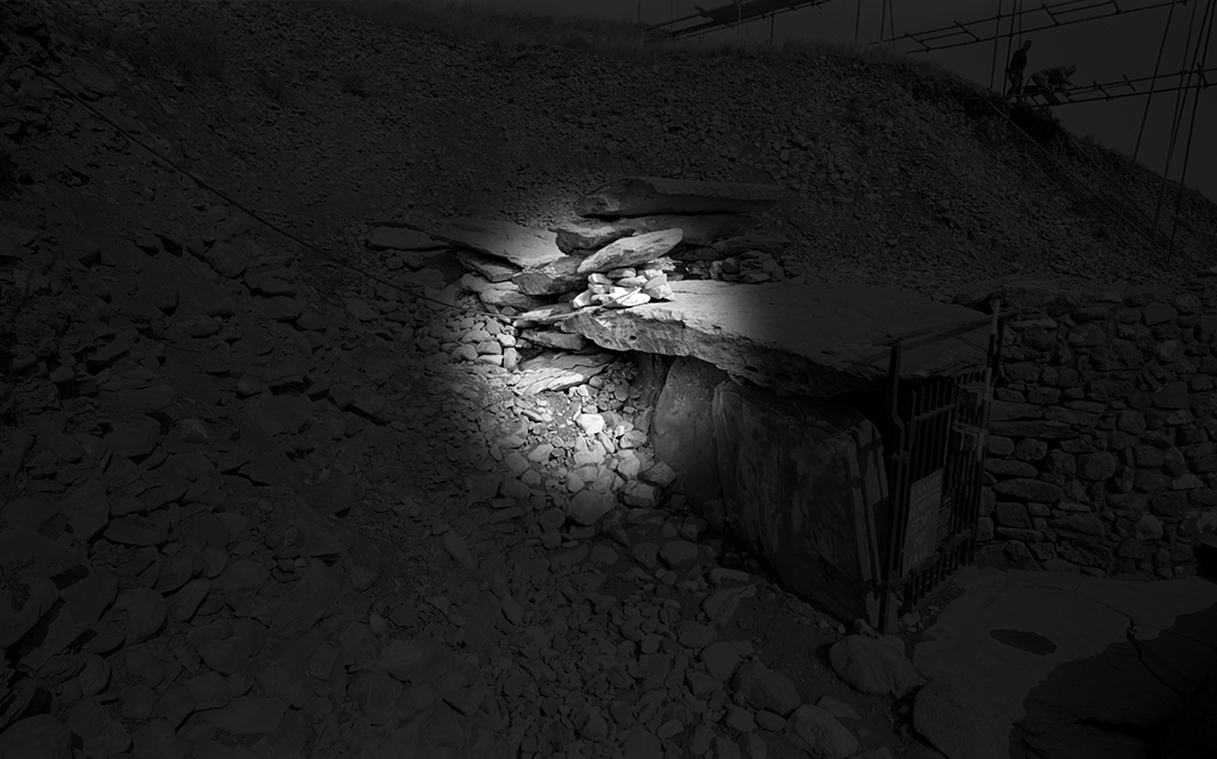 Newgrange passage tomb in the Boyne Valley, Co. Meath, Ireland. Picture taken during excavation by Prof. M. J. O’Kelly ME019-045—- Class: Megalithic tomb – passage tomb Townland: NEWGRANGE